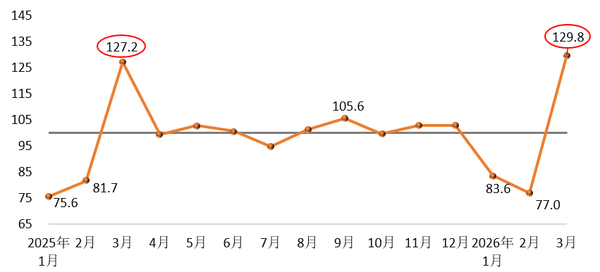 一、3月份建筑材料工业景气指数2026年3月份建筑材料工业景气指数为129.8点,高于临界点,处于景气区间,比1、2月份明显回升,回升幅度高于上年同期。受天气及春节假期等季节性因素影响,